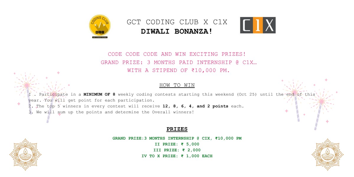 The GCT Coding Club, guided by Dr. Devi R ma'am and patronised by Principal Dr.K. Manonmani, just dropped something exciting a Diwali coding contest in collaboration with C1X that could land you a 3-month paid internship.
