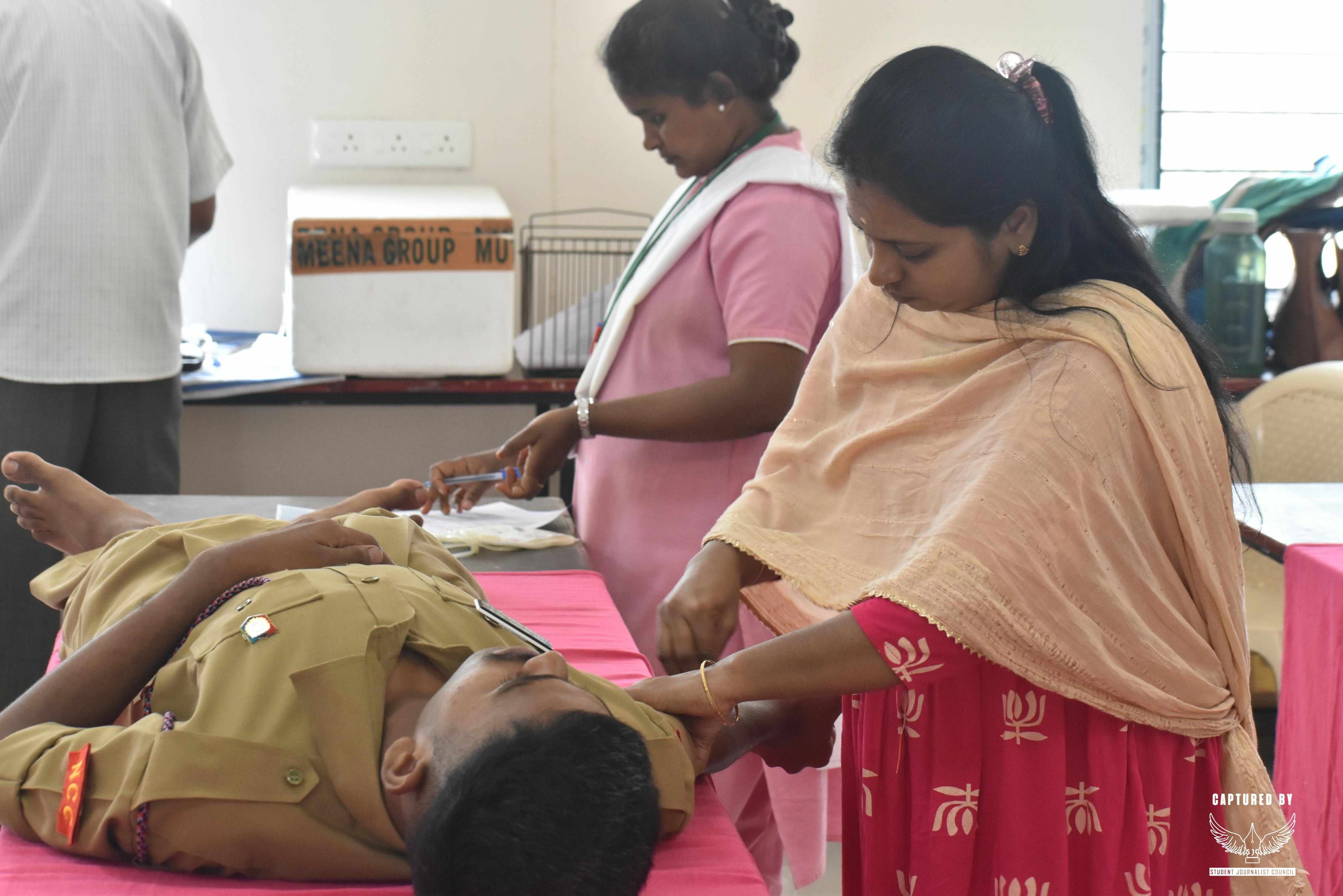 A blood donation camp was stationed at the Platinum Jubilee Building. And I wished to partake in it and donate blood. The volunteers enrolled my name and checked my weight, the doctors checked my hemoglobin level, and finally, they did a general checkup. After all these steps, I donated my blood. The doctors and nurses were kind. After donating the blood, the Rotaract volunteers took care of me and gave me medicines. At that time, I heard one person came to donate blood who had one of the rarer blood groups, AB+.