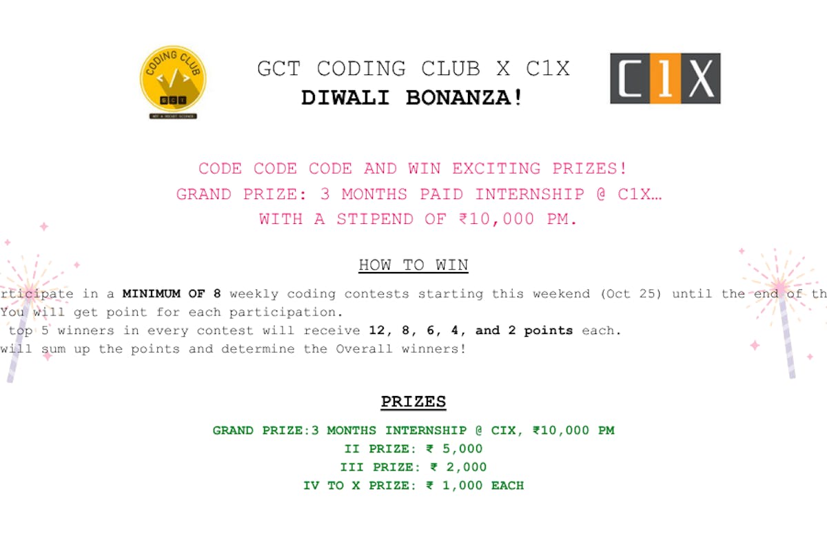 The GCT Coding Club, guided by Dr. Devi R ma'am and patronised by Principal Dr.K. Manonmani, just dropped something exciting a Diwali coding contest in collaboration with C1X that could land you a 3-month paid internship.